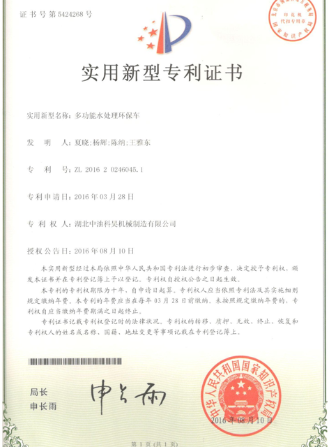 中油科昊屬于第四屆湖北省環(huán)境保護(hù)產(chǎn)業(yè)協(xié)會(huì)常務(wù)理事單位;通過(guò)ISO9000審核獲得油田廢水、廢油、廢油泥、壓裂返排液處理環(huán)保設(shè)備的設(shè)計(jì)及生產(chǎn)資質(zhì);獲得環(huán)境污染治理資格證書(shū);2016年,公司生產(chǎn)的壓裂液返排車(chē)獲得湖北省重大科技專(zhuān)項(xiàng)??脐粓?jiān)持為用戶(hù)打造優(yōu)質(zhì)、專(zhuān)業(yè)、定性化石油環(huán)保解決方案,更好的為客戶(hù)創(chuàng)造品質(zhì),讓用戶(hù)獲得價(jià)值。
